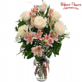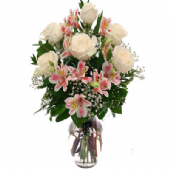Bouquet consisting of 5 white roses and 5 sprigs of alstroemeria of various colors depending on availability.