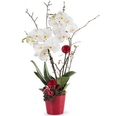 Μια πανέμορφη ολόλευκη ορχιδέα σε λευκό ή κόκκινο κασπώ διακοσμημένη με κουκουνάρες,χριστουγεννιάτικα στολίδια κλπ!