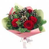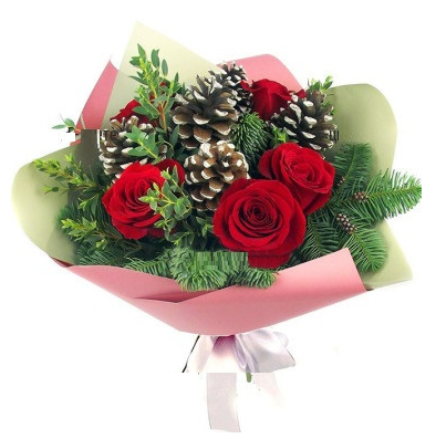 Κόκκινα τριαντάφυλλα,κουκουνάρες χρωματιστές,κλαδιά έλατου,ευκάλυπτου κλπ σε εορταστικό αμπαλάζ.